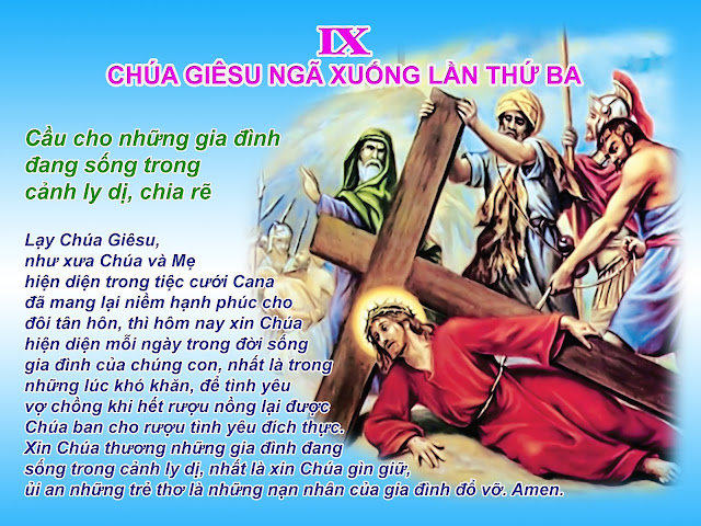 LN: Lạy Chúa Giêsu, như bà Vê-rô-ni-ca đã an ủi Chúa, xin cho người vợ luôn biết thông cảm và an ủi chồng mình trong đau khổ, thử thách. Xin cho các người mẹ biết dạy con cái mình lòng thương xót và sự tế nhị, để chúng thực hiện những đức tính ấy trong đời sống.